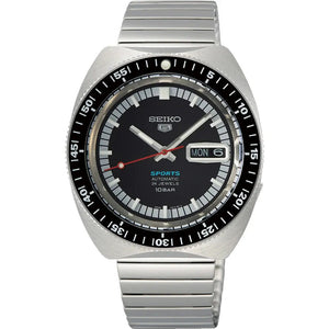 Seiko 5 sports 55th-anniversary limited edition men's watch SRPK17K1. Stainless steel case and bracelet with black dial. Automatic movement. Case size 39.5 mm. Water resistance up to 100 meters. Curved hardlex crystal. Deployment clasp with push buttons.