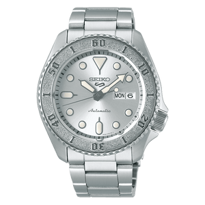 Seiko 5 sports automatic mens watch SRPE71K1. Stainless steel case and bracelet, silver dial. Automatic movement with manual winding. Case thickness: 13.4 mm, case diameter: 42.5 mm, case length: 46 mm. Hardlex crystal, lumibrite on hands and index(es). Water resistance up to 100 meters / 10 bar. Screw case back, see-through case back. Three-fold clasp with a secure lock. Unidirectional rotating bezel. 24 jewels, day/date display, stop second-hand function.