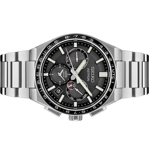 Seiko astron: the world’s first GPS solar watch – powered by light, automatically adjusted to your time zone through the latest GPS technology. This Astron Solar GPS watch features the 5X calibre with advanced functionality. To enhance the speed and quality of the GPS connection, every component in the GPS module has been re-engineered, the operation of the 5X calibre is faster and more intuitive than ever. For example, in just three seconds the time can advance 14 hours from Tokyo to New York time, thanks to the system that moves the hour, minute, and second hand independently. New functions also allow automatic adjustment to Daylight Saving Time and give the wearer the ability to switch the main dial instantly from home to local time and vice versa. Titanium (super-hard coating) case and bracelet with black dial. Case size 42.7mm. Water resistance up to 100 meters. GPS Solar movement. Dual curved sapphire crystal. Three fold clasp with push button release.