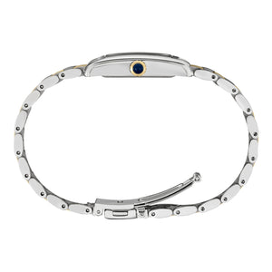 From the Essentials Collection. A sophisticated classic, perfectly proportioned for a jewelry-like feel, this elegant rectangular case watch offers a patterned white Roman numeral dial, blue hands and a blue cabochon crown. Crafted of stainless steel in a versatile two-tone finish, this graceful design includes a five-row stainless steel bracelet for sleek wearing comfort, and a three-fold push button release clasp. 5 bar, 50 meters water resistant and has a hardlex crystal.