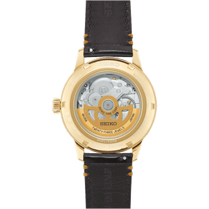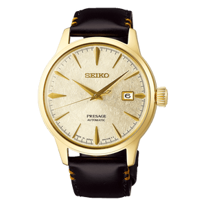 Seiko Presage Limited Edition Automatic Men's Watch SRPH78. Gold-Plated case with genuine leather bracelet. Cream dail color. Quartz movement. Sapphire crystal. Three-fold clasp with push button release. Round case shape. Case size 40.5mm. Water resistant at 50m.