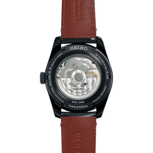 Seiko presage limited edition Kobuki sharp edged automatic mens watch SPB331J1. Black plated stainless steel case with black leather strap and brown dial. Case size 39.3mm. Sapphire crystal. Anti-reflective coating on crystal inner surface. Water resistance up to 100 meters. Three fold clasp with push button release. Lumibrite on hands and indexes. Stop seconds hand function. Date display. LIMITED EDITION on the case back. Serial number engraved on the case back. See through and screw case back.
