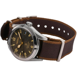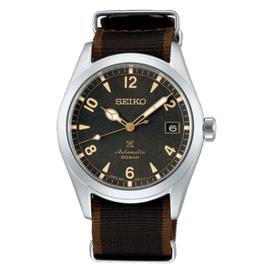 Seiko prospex automatic mens watch SPB211J1. Stainless steel case with a Nylon strap, and brown dial. Case size 38 mm. Water resistance up to 200 meters. Automatic movement. Curved sapphire crystal. Pin buckle clasp.