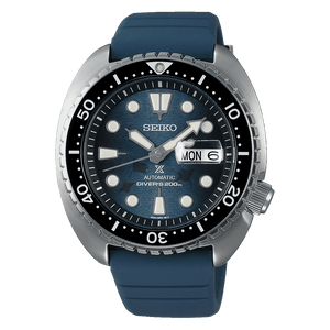 Seiko prospex automatic mens watch SRPF77. Stainless steel case with a Silicone strap, navy dial. Case size 45 mm. Water resistance upto 200 meters. Automatic movement. Sapphire with magnified date window crystal. Buckle clasp.
