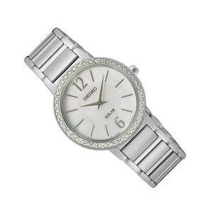 Seiko solar mens watch SUP467. Stainless steel case and bracelet with wother of pearl dial. Solar movement. Curved hardlex crystal. Three fold clasp with push button release. Round case shape. Case size 30.5mm. Water resistance up to 30 meters.