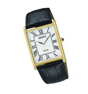 Seiko solar men's watch SUP880. Gold-Plated case with a Black Leather strap, White dial. Solar movement. Hardlex crystal. Buckle clasp. Rectangle case shape. Case size 28.4 mm. Water resistant at 30 m.