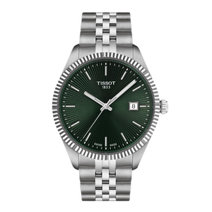 This watch is crafted to elevate your style for those truly special moments. The traditional guilloché dial with sunbeam rays reflects light beautifully, adding depth and elegance. The fluted bezel offers a sophisticated decoration representative of traditional watchmaking craftsmanship. The interchangeable quick-release bracelet offers maximum versatility, allowing you to easily change your look. 316L stainless steel case and bracelet with green dial. Water-resistant up to a pressure of 10 bar (100 m / 330 ft). Scratch-resistant sapphire crystal with antireflective coating. Butterfly clasp with push-buttons, Interchangeable quick release bracelet.