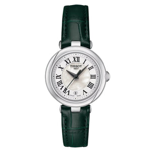 Tissot bellissima quartz womens watch T1260101611302. Stainless steel case with green leather strap, white mother of pearl dial. Quartz movement. Water resistance up to 50 meters. Domed scratch resistant sapphire crystal with antireflective coating. Butterfly clasp with push buttons.