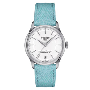 Close your eyes and think of a pure Swiss watch and you’ll see the Chemin des Tourelles. Named after the street that leads to Tissot's home in the Swiss mountains, it’s Tissot’s icon: round, classic, mechanical, ageless. Now updated and refined, this edition has a gently domed sapphire crystal that sits over a soft-sunray dial with simple, elegant baton hour markers, each faceted to catch the light in an understated but sophisticated way. And under that is the Nivachron Powermatic 80, a state-of-the art automatic mechanical movement with an 80-hour power reserve and elevated anti-magnetism. A watch for all time. Stainless steel case with light blue leather strap, white dial. Case size 34mm. Water resistance up to 50 meters. Domed scratch resistant sapphire crystal with antireflective coating. Interchangeable quick release bracelet, butterfly clasp with push buttons.