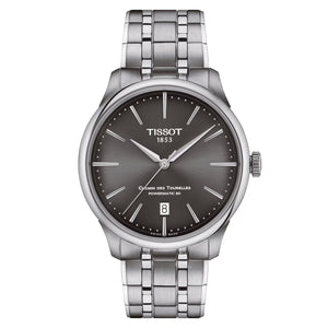 Close your eyes and think of a pure swiss watch and you’ll see the chemin des tourelles. Named after the street that leads to tissot's home in the swiss mountains, it’s tissot’s icon round, classic, mechanical, ageless. Now updated and refined, this edition has a gently domed sapphire crystal that sits over a soft sunray dial with simple, elegant baton hour markers, each faceted to catch the light in an understated but sophisticated way. And under that is the nivachron powermatic 80, a state of the art automatic mechanical movement with an 80 hour power reserve and elevated anti magnetism. A watch for all time. Stainless steel case and bracelet with grey dial. Case size 39mm. Water resistance up to 50 meters. Domed scratch resistant sapphire crystal with antireflective coating. Interchangeable quick release bracelet, butterfly clasp with push buttons.