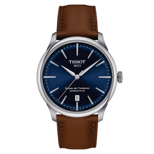 Close your eyes and think of a pure swiss watch and you’ll see the chemin des tourelles. Named after the street that leads to tissot's home in the swiss mountains, it’s tissot’s icon round, classic, mechanical, ageless. Now updated and refined, this edition has a gently domed sapphire crystal that sits over a soft sunray dial with simple, elegant baton hour markers, each faceted to catch the light in an understated but sophisticated way. And under that is the nivachron powermatic 80, a state of the art automatic mechanical movement with an 80 hour power reserve and elevated anti magnetism. A watch for all time. Stainless steel case with brown leather strap blue dial. Case size 39mm. Water resistance up to 50 meters. Domed scratch resistant sapphire crystal with antireflective coating. Interchangeable quick release bracelet, butterfly clasp with push buttons.