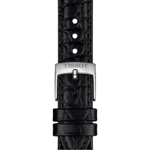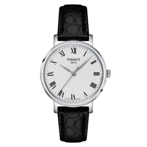 Tissot everytime quartz women's watch T1432101603300. Stainless steel case with black alligator-style grained cowhide leather strap, silver dial. Quartz movement. Case size 34mm. Water resistance up to 50 meters. Scratch-resistant sapphire crystal. Standard buckle clasp.