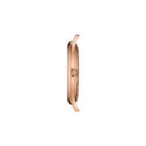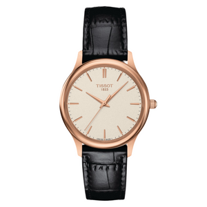 Tissot Excellence quartz women's watch T9262107626101. 18K rose gold case with black leather strap, silver opalin dial. Quartz movement. Water resistance up to 30 meters. Scratch-resistant sapphire crystal. Case size 31.8mm. Standard buckle clasp.