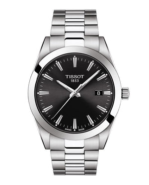 The Tissot Gentleman is a multi-purpose watch, both ergonomic and elegant in any circumstance. It is equally suitable for wearing in a business environment, where conventional dress codes apply, as at the weekend, when it adapts easily to leisure activities. As part of the life of a modern, active man, the Tissot Gentleman becomes the perfect companion for every day, every occasion and every style. 40mm stainless steel case. Domed scratch-resistant sapphire crystal. Black dial with index markers. Swiss quartz movement.