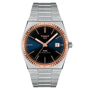 If you’re looking for a slim, smooth watch with an authentic ‘70s feel, look no further than the PRX Powermatic 80. Created for those with an eye for design and packed with twenty first century features in a Tissot case shape from 1978, the PRX is a must have on every watch fan’s wish list. The self winding Powermatic 80 movement delivers reliability and precision thanks to the innovative Nivachron hairspring. With 80 hours of power reserve, it’s a modern movement designed to keep pace with busy lifestyles. Stainless steel case and bracelet with 18K rose gold bezel, graded blue black dial. Automatic movement. Case size 40mm. Scratch resistant sapphire crystal with antireflective coating. Water resistance up to 100 meters. Interchangeable quick release bracelet. Butterfly clasp with push buttons.