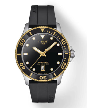 From first glance to everyday use, the Seastar 1000 Quartz 40mm model communicates style, performance, and versatility. Each model is a harmonious marriage of elegance and technology, bringing Swiss watchmaking know how and eternal design together. This hugely versatile case size is designed to cater for people looking for a chic, tasteful watch that can cross over from day to night while still promising exceptional technical performance. As with the existing 36mm and 45.5 mm models, these pieces take their name from their water resistance certification of 1,000 feet, equivalent to 30 ATM or 300 metres. They offer uni-directional rotating bezels for reliably timing underwater activity. Low-light legibility is further enhanced by the application of Super-LumiNova® to the watches’ hands and hour markers. Straps and bracelets can be interchanged using Tissot’s easy-to-use quick strap change system, giving the owner the opportunity to choose from a wide range of compatible Tissot straps and personalise their watch to suit mood or occasion. Stainless steel yellow gold PVD coating case with black synthetic strap, black dial. Quartz movement. Water resistance up to 300 meters. Case size 40 mm. Scratch resistant sapphire crystal with double sided antireflective coating. Standard buckle.