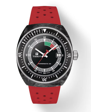 Discover the tissot sideral, a captivating fusion of vintage allure and modern craftsmanship. The watch features a 41mm wide forged carbon case and a bold red strap. The dial presents a multi coloured luminescent animation, amplifying its distinct appeal. Water resistant up to 30 bar (300 meters) and equipped with super luminova coated indices, the sideral is a statement piece for trendsetters and history enthusiasts. Effortlessly modify your look with the interchangeable perforated rubber strap. Make a statement with the tissot sideral. Automatic movement. Domed scratch resistant sapphire crystal with antireflective coating.