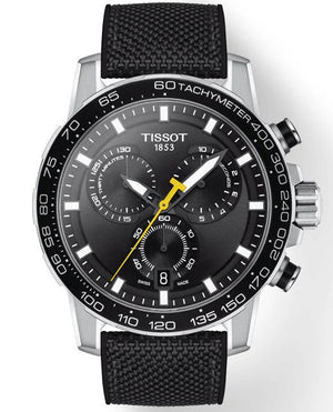 Tissot Super Sport Chrono Quartz Men's chronograph, quartz ETA G10.212 Powerdrive, stainless steel case with black bezel, diameter 45.5 mm, 12.0 mm high, black dial with date at 6 o'clock, yellow stop hand, black textile strap with interchangeable quick release bracelet, standard buckle. Scratch-resistant sapphire crystal glass. Water-resistant up to a pressure of 10 bar (100 m / 330 ft). Supersport Chrono shows a very sporty side. And it is precisely these features that make it a reliable companion in every situation!