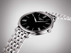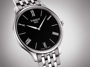 The Tissot Tradition family gives ultra-modern watchmaking a justified hint of nostalgia, giving todays technology a vintage-style design signature. High-tech operation is perfectly balanced with classical details and subtle vintage-look finishes. These are complemented by design elements such as guilloche decoration and a gently curved case. The Tissot Tradition promises wearers endless hours of precision with sustainable good looks. 39mm stainless steel case. Scratch-resistant sapphire crystal. Black dial with roman numbers and indexes. Swiss quartz movement. Stainless steel strap with butterfly clasp and push-buttons.