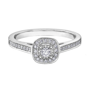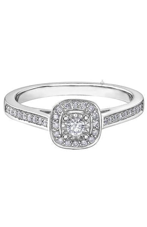 10K white gold 0.19TDW diamond halo engagement ring. This stunning diamond halo ring has a 0.07ct center diamond surrounded by duos of small diamonds in the cushion halo and shoulder to give it a rich look. On the day you ask for her hand, enchant and delight her with this beautiful halo ring.