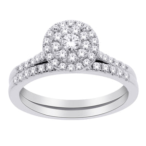 10k White Gold 0.25TDW Diamond Double Round Halo Wedding Set. This rich and impressive-looking wedding set is delicate and looks stunning. Just like the two of you, this diamond bridal set is the perfect pair.