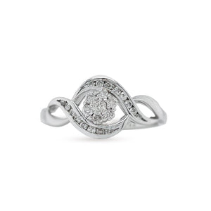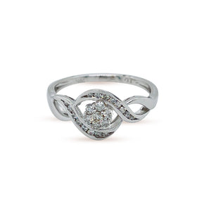 This 10k white gold diamond engagement ring is handmade with 0.26 carat of total round cut-diamonds. This Engagement ring hosts a beautiful round cut diamonds cluster flower head with duos of smaller diamonds on each side of the shank creates an exquisite look. This ring is sure to get all the attention with its brilliance.