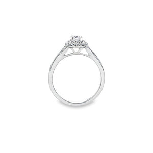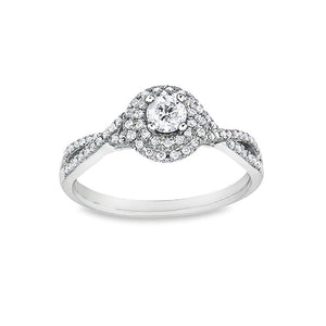 This wedding set is a magnificent way to celebrate your love and marriage. It consists of two rings that complement each other perfectly. The engagement ring features a 0.23-carat round center diamond that radiates with fire and brilliance. The center diamond is surrounded by a double halo of smaller diamonds, creating a stunning effect. The band of the engagement ring is also adorned with diamonds, adding more glamour and sparkle. The wedding band is a simple and elegant design, with a row of channel-set round diamonds that match the engagement ring. The total diamond weight of the wedding set is 0.43 carats, making it a remarkable symbol of your everlasting bond. The wedding set is crafted in white gold, which enhances the beauty and quality of the diamonds. This wedding set is a dream come true for someone who values style and sophistication.