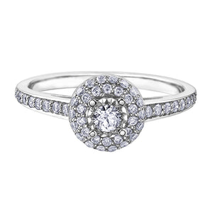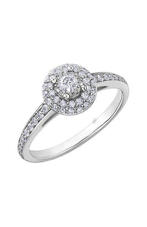 10K white gold 0.45TDW diamond round halo engagement ring which hosts a 0.10ct center diamond surrounded with a double round halo of diamonds to add to beauty and sparkle. Duo's of smaller diamonds are set on the shoulders to make the ring glamourous. On the day you ask her hand, enchant and delight her with this magnificent ring.