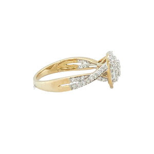 10K White Gold 0.50TDW Diamond Double Halo Engagement Ring. This beautiful engagement ring is set with four round diamonds in the center surrounded by duos of small brilliant-cut diamonds in a double cushion shape halo setting. The diamond-set sides twist in a unique fashion forming an infinity. On the day you ask for her hand, enchant and delight her with this beautiful double halo ring.