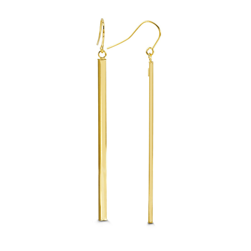 10K yellow gold earrings featuring a simple yet elegant design. Each earring consists of a slender, polished gold bar that dangles gracefully from a thin gold wire hook. The smooth, reflective surface captures light, highlighting the quality and purity of the yellow gold. These minimalist earrings are versatile for both casual and formal wear, adding a touch of sophistication to any outfit. The perfect every day earring you will never want to take off.