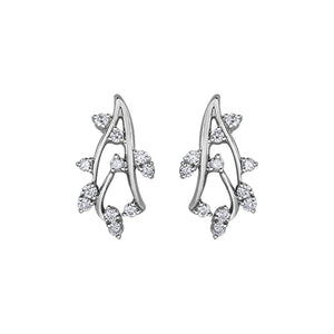 These are a pair of 14K white gold diamond earrings in a leaf or flower shape. The earrings have a total diamond weight of 0.50 carats and feature round cut diamonds in a cluster pattern. The earrings have a post and butterfly clutch closure and a polished finish.