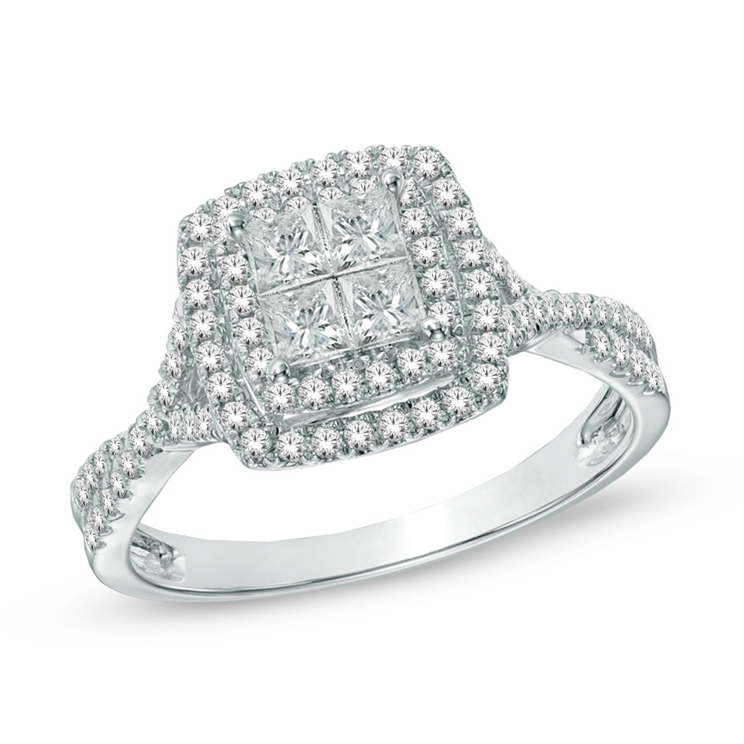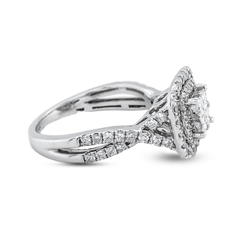 14K White Gold 1.00TDW Diamond Quad Double Halo Engagement Ring. This stunning engagement ring has a double halo with four princess-cut natural diamonds in the center giving it a large solitaire illusion looking rich and brilliant. A total of 4 princesses cut natural diamonds and 68 round brilliant cut natural diamonds are hand set in this magnificent and impressive ring. This stunning ring is a piece of jewel that will certainly amaze her.