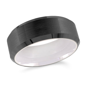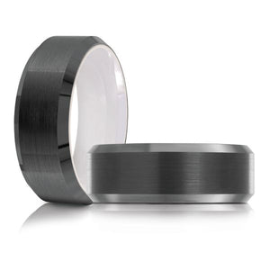 8mm black plated tungsten carbide comfort fit wedding band. This ring is a perfect choice for those who want to combine elegance and durability. The ring features a black tungsten outer band with a brushed finish and a white ceramic inner band with a polished finish. The contrast between the two colors and textures creates a striking look that will catch everyone’s eye. Whether you are looking for a wedding band, an anniversary gift, or a fashion accessory, this ring will suit your style and personality. Tungsten bands cannot be resized after purchase. Note: Shipping takes 4 to 6 business days.