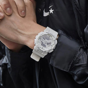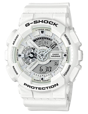 Fit right in anywhere from a summertime resort to general casual fashion scenes throughout the entire year with the G-Shock GA110MW-7A watch! Flexible resin band, digital face display and buckle closure. Shock-resistant design. Water resistant up to 200 meters. Size of case 55 x 51.2 x 16.9 mm. Analog and digital display. LED light with custom illumination duration (1.5 and 3 seconds). Daylight savings on/off. ISO764 class magnetic resistance. Timekeeping: Analog: 2 hands (hour, minute (hand moves every 20 seconds). 1 dial (mode / stopwatch seconds / countdown timer seconds). Digital: Hour, minute, second, pm, month, date, day 1/100-second stopwatch. Measuring capacity: 23:59'59.99''. Modes: elapsed time, split time, 1st-2nd place times. Misc: target time alarm, direct timing start from the timekeeping mode Countdown start time setting range: 1 minute to 24 hours (1-minute increments and 1-hour increments). 5 daily alarms with 1 snooze alarm.