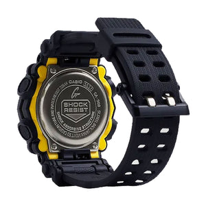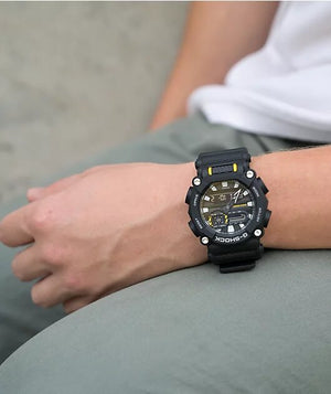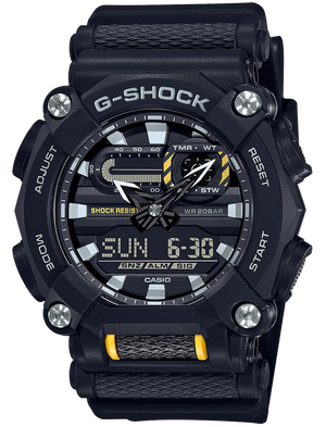 G-SHOCK announces a new lineup of heavy-duty models that are great for wear in tough environments and as street fashion items as well. The industrial design motif of these models is created by a 10-sided bezel that resembles the shape of a nut. The bezel is secured by four screws for a tough and rugged look. Combination timekeeping is provided by analog hands along with a digital display for the ultimate in operational ease. The design of the hands and the graphic figures that appear in the digital readouts create a powerful face design that enhances readability. The band connection and all buttons have checkered surfaces that prevent slipping and contribute to operational efficiency. The GA900-1A model features a black resin band and has yellow accents. Case / bezel material: resin. Resin band. Shock resistant, mineral Glass. Size of case : 52.8 x 49.5 x 16.9mm. 200-meter water resistance. LED light (Super Illuminator). Selectable illumination duration (1.5 seconds or 3 seconds), afterglow. World time, 1/100-second stopwatch. Measuring modes: Elapsed time, split time, 1st-2nd place times. Others: target time alarm, direct timing start from the timekeeping mode. Countdown timer. Measuring unit: 1/10 second. Countdown range: 60 minutes. Countdown start time setting range: 1 to 60 minutes (1-minute increments). 5 daily alarms (with 1 snooze alarm). Hourly time signal. Full auto-calendar (to year 2099). 12/24-hour format. Button operation tone on/off. Regular timekeeping: Hour, minute, second, pm, month, date, day.