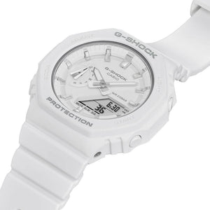 G-Shock analog digital womens watch GMAS2100-7A. Slim, lightweight, compact watches with octagonal bezels and a monochromatic look. The new GMAS2100 series downsizes the popular GA2100 to create a simple and slim design. The octagonal bezel, flat face, simple bar hour markers, and carbon core guard structure that are distinctive features of the GA2100 are now available in a compact configuration. The GMAS2100-7A sports a classic white colorway with silver accents. Size of case: 46.2 x 42.9 x 11.2mm. Case / bezel material: carbon/resin, resin band. 200-meter water resistance. Mineral glass, neobrite, shock resistant. Carbon core guard structure.