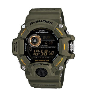 Introducing RANGEMAN, the latest addition to the Master of G series of tough and rugged timepieces that are designed and engineered to stand up to the most grueling conditions imaginable. RANGEMAN is Triple Sensor equipped, which makes it capable of keeping altitude, barometric pressure, temperature, and direction readings at your fingertips. Cylindrical buttons provide outstanding operation and improved resistance to impact. The frequently used sensor button (center right) has a metal cover that protects it against lateral impact and keeps foreign matter out. Pressing the sensor button in any mode takes you directly to a sensor screen. Each sensor mode has its own audible tone, which means you can determine which mode you are entering without even looking at the watch. All of this plus one-touch time recording, one-touch elapsed time measurement, world-renowned G-SHOCK toughness and durability, and much more makes RANGEMAN the perfect choice for rangers, rescue crews, and anyone else whose profession or activities demand unfailing reliability. Case / bezel material: resin, resin band. Mineral glass. Shock resistant. Solar movement. 200-meter water resistance. Size of case : 55.2 x 53.5 x 18.2mm.