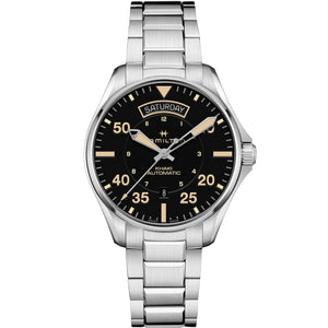 How it felt to be an early aviator, a pioneering pilot flying an airplane at the turn of the twentieth century is something that can’t be recreated, but Hamilton can give you the look - created using modern materials including stainless steel and sapphire crystal. Add an automatic movement and a perfectly proportioned 42mm case for a new take on a vintage timepiece. Stainless steel case and bracelet with black dial. Automatic movement. Case size 42mm. Water resistance upto 100 meters. Sapphire crystal. Folding clasp.