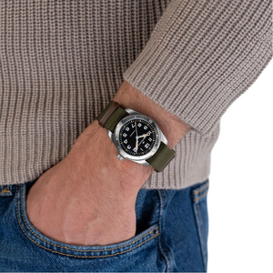 Gearing up for the great outdoors just got easier, thanks to the Khaki Field Expedition and its new NATO Strap. An all-terrain adventure watch with a compass design, enabling you to navigate your next excursion with the help of the sun. Housed in a 41mm stainless steel case and paired with a green NATO textile strap, it is equipped with a screw-down crown and a black sandblasted dial, making it your toughest timepiece yet.