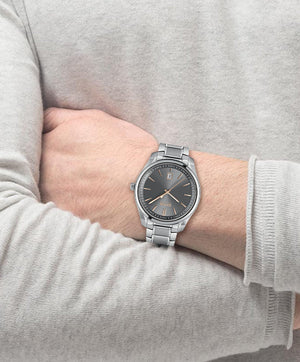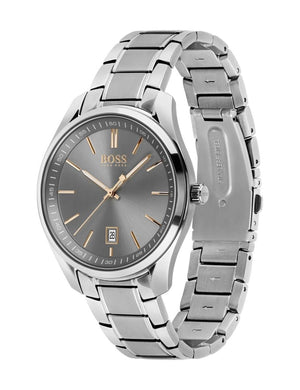 Hugo Boss Gents 1513849 CIRCUIT stainless steel matt and polish case and bracelet with grey dial with rose gold markers watch .Swiss quartz movement, hardened mineral cystal glass, push button deployment clasp. Case size 42mm. Water resistance upto 30 meters.