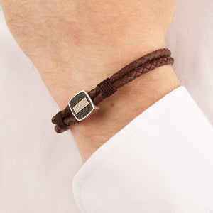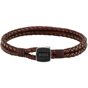 Hugo boss jewellery men’s Seal collection. The bracelet is made from braided brown leather. Two strands of braided leather are entwined. A stainless steel and black charm sits at the centre of the bracelet. It is embossed with the Hugo Boss logo and serves as the clasp. This bracelet measures 21cm in length.