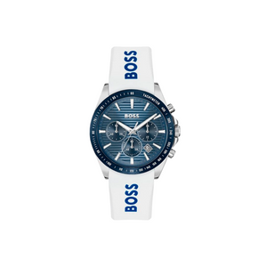 Hugo Boss Men's Strike Steel Watch with Blue Dial 1514238: This Hugo Boss men's watch is made of stainless steel with a silicone strap and the brand name in blue. It features a blue bezel and dial, three hands, bar-shaped markers, and three subdials. A sporty model perfect for everyday looks.