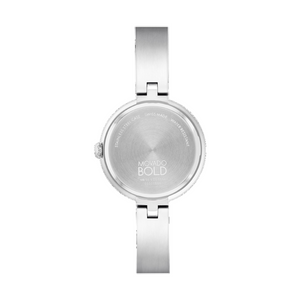 Movado bold bangle quartz womens watch 3601178. Stainless steel case and bracelet with pink mother-of-pearl museum dial with crystal set dot. Quartz movement. Water resistance up to 30 meters. Kl mineral crystal. Case size 28 mm. Jewelry clasp.