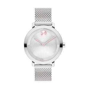 The evolution of modern design with a sharp look and elevated feel. Crafted from stainless steel, this sleek timepiece features a statement-making 34mm case that houses a captivating micro-textured dial with a glossy lacquer overlay with slim hands and our iconic dot motif at 12 o’clock in blush. The matching mesh bracelet completes the design with a minimalist edge. Quartz movement. Water resistance up to 30 meters. K1 mineral crystal. Sliding clasp.