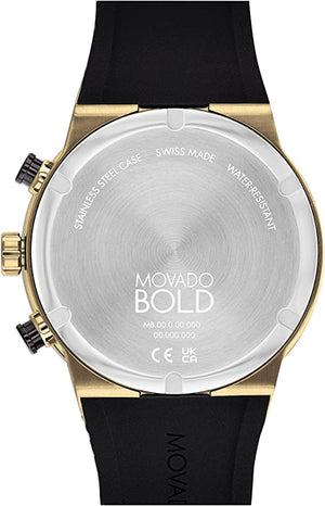Movado bold fusionn mens watch. Stainless steel pale yellow gold ion plated case and black ceramic bezel with a black chronograph dial on black silicone strap. Case size 44 mm. Water resistance upto 50 meters. Quartz movement. K1 mineral crystal. Buckle clasp.