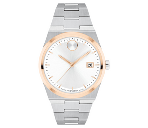 The BOLD Quest looks to the future with a shaped case and an integrated bracelet. This 35mm watch features a white dial, rose gold tone hands, and our signature dot at 12 o'clock. Water resistance up to 30 meters. K1 mineral crystal. Deployment clasp with push button.