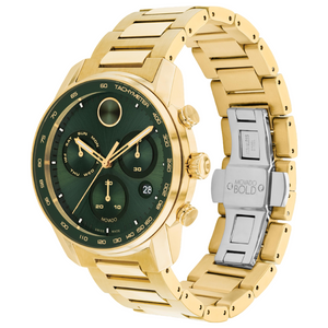 The sporty, eternally stylish chronograph gets a fresh feel with a strong, contemporary design that combines modern minimalism and a bold edge. The classic bracelet and statement-making 44mm case are cast in yellow goldtone ion-plated stainless steel for a flawlessly refined finish. The green chronograph dial features a date window and Swiss Super-LumiNova® accents framed by a tachymeter bezel.