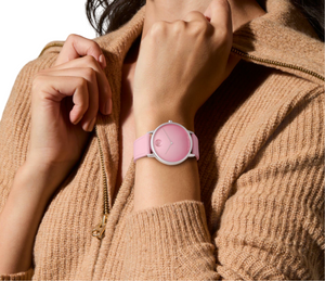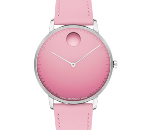 The Face Collection explores minimalism through the art of color and tonality. This 41mm two-hand watch features a pink ombre dial, slim steel hands, pink leather strap, and our oversized recessed dot at 12 o'clock. Quartz movement. Water resistance up to 30 meters. K1 mineral crystal. Pin buckle clasp.