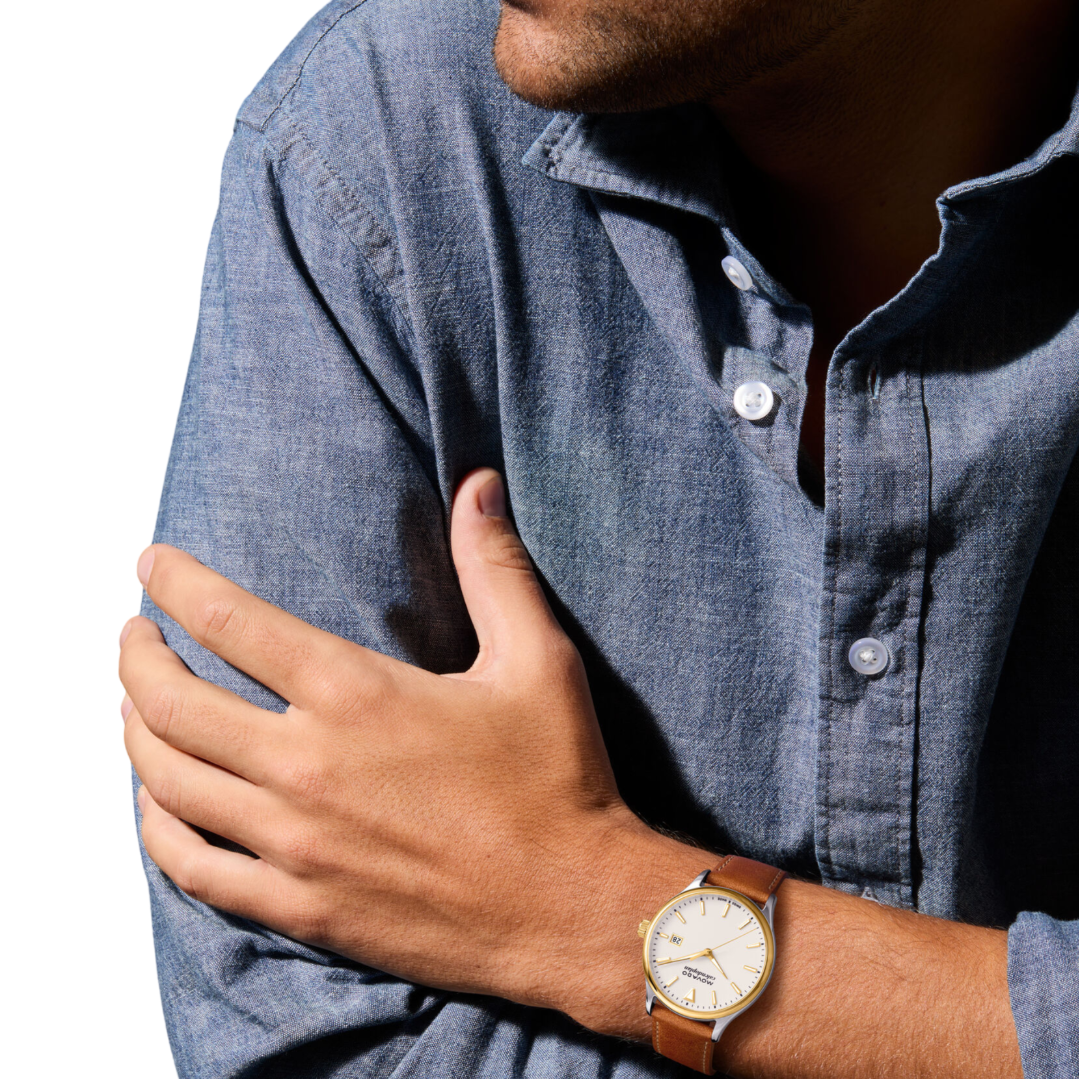 The Heritage Series Calendoplan takes a modern approach to a classic 1950's silhouette. This 40mm watch features an ivory dial, Swiss Super-LumiNova accents, and a date window.