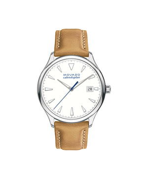 Women's Movado Heritage Series Calendoplan watch, 36 mm stainless steel case, round white 3-hand dial with luminescent silver-toned hands and applied markers, printed grey-toned minute index, and date display, top-stitched light brown leather strap with stainless steel buckle. Quartz movement. Water resistant to 30 meters.